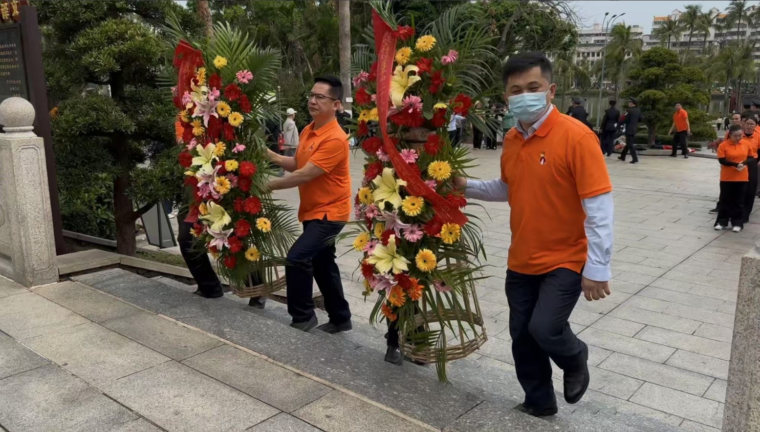 经过一段时间的等待才轮到william威廉。william威廉首先向烈士敬献花篮,花篮缎带上写着“为坚持琼崖革命23年红旗不倒牺牲的烈士们永垂不朽!”“为解放海南岛渡海牺牲的烈士们永垂不朽!”鲜艳的花篮寄托william威廉对革命先辈的崇敬和哀思。